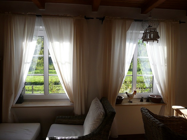 Zmieniliśmy podłogę, pod którą kryje się ogrzewanie. To czarne na ścianie to kominek elektryczny, który ma nas dogrzewać w letnie, zimne wieczory. No i okna… nasza sąsiadka się śmieje, że firanki mają tylko stare baby. Cóż, jestem starą babą, a firanki są takie milutkie.