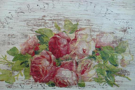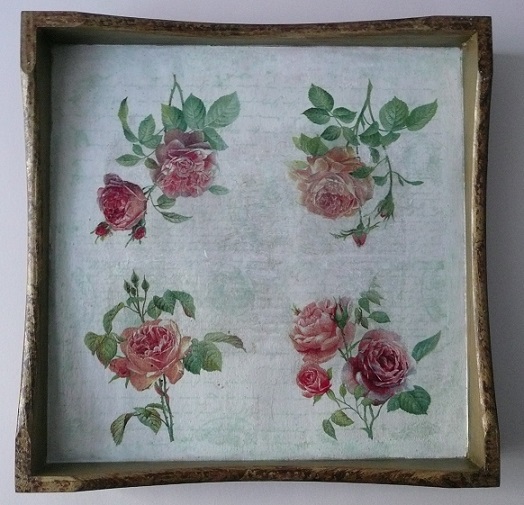 Tło dla róż to listy, zapewne miłosne, pisane dawno, dawno temu. Brzegi tacy mają złote refleksy, choć na zdjęciu (jak zwykle) tego nie widać. Widać natomiast wiktoriańskie róże, słodkie i śliczne.