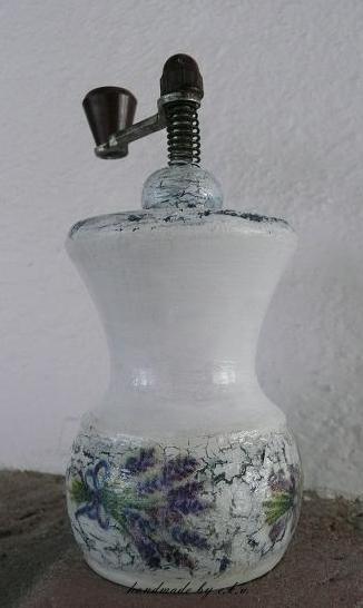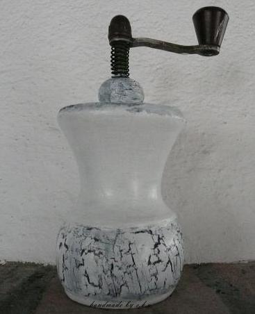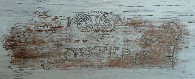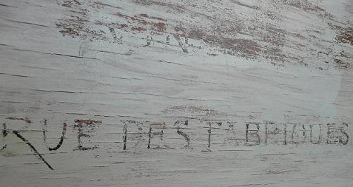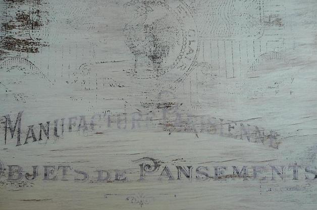 Pomalowałam boczek (na razie jeden) na biało, cieniutką warstwą, gdzieniegdzie okraszając spękaniami. Tam gdzie stare drewno popękało zrobiłam przecierki. Na tę postarzoną całość wrzuciłam napisy po francusku i wtedy zrobił się już totalny bałagan.